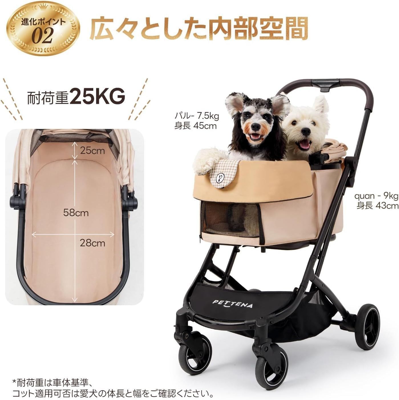 PETTENA ペットカート 小型犬 分離型 犬カート 耐荷重25 kg X-FOLD 技術 キャリーコット付ワンタッチ折り畳み 広い空間 自立 軽量 犬バギー お出かけ用 猫 犬ベビーカー ORION ベージュ