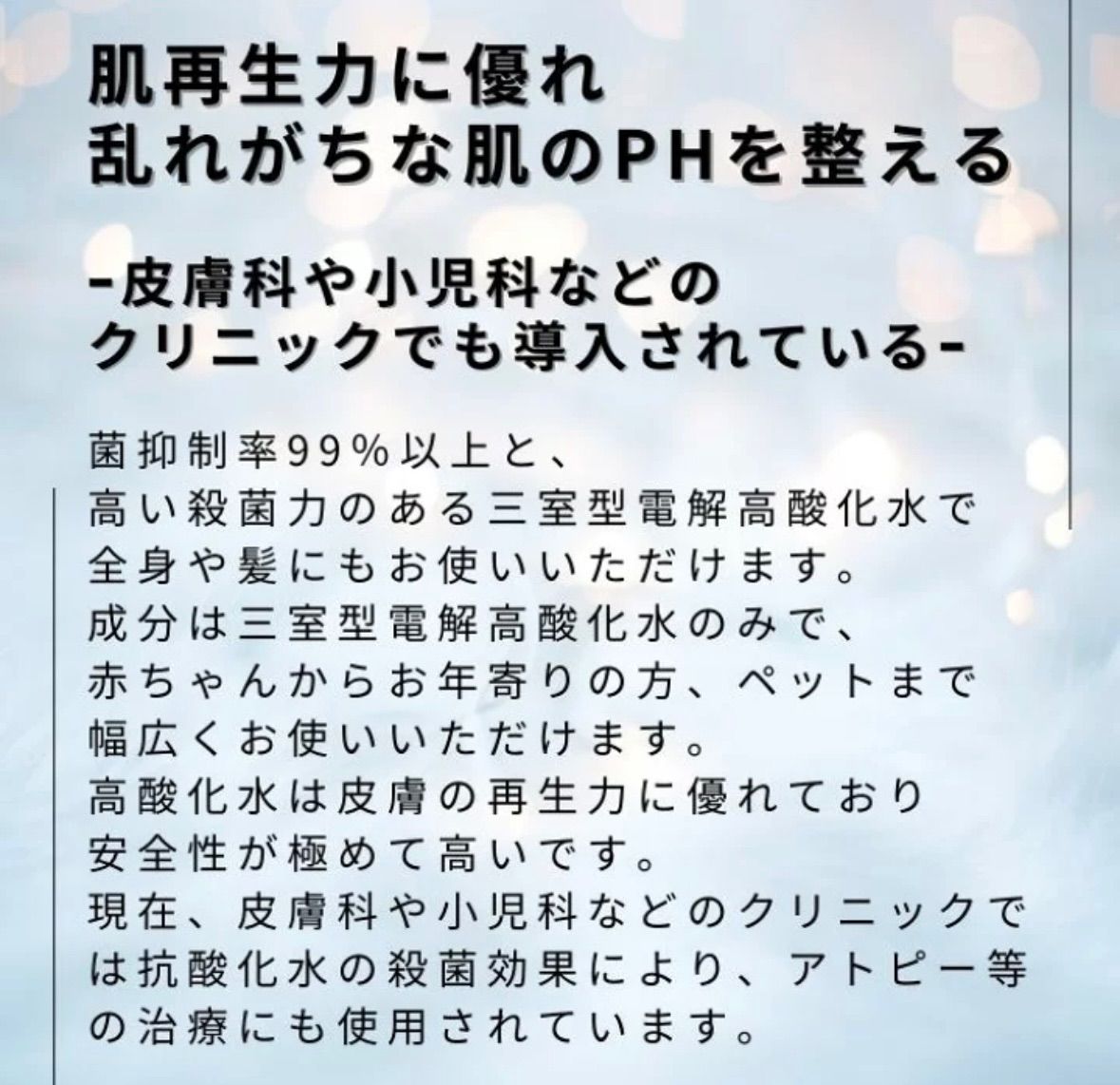 #&themecell #アンドザミセル #プライムミストウォーター #三室型電解高酸化水 #電解水 #ph値 #菌抑制率99%以上 #優しい #保湿 #殺菌 #ニキビ肌 #乾燥肌 #アトピー肌 #肌荒れ #オムツかぶれ #無香料 #無添加 #赤ちゃん #ペット