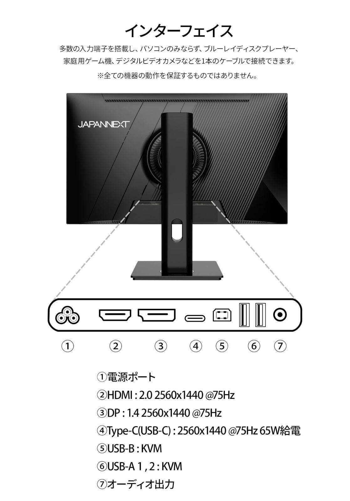JAPANNEXT 27インチ モニター WQHD 2560x1440解像度 IPS ディスプレイ (KVM/HDMI/USB-C 給電 (65W) / DisplayPort/スピーカー内蔵/高さ調節/回転(ピボット)機能/VESA対応/ブルーライトカット) JN-i27QR-C65W-HSP