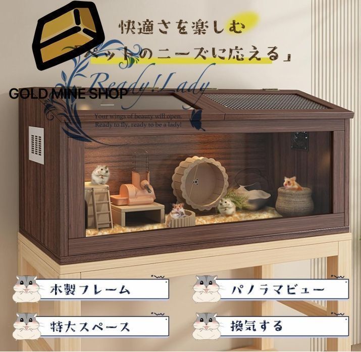 小動物 ケージ ハムスター モルモット デグー ハリネズミ 木製 通気性 観察しやすい チンチラの飼育に使用 掃除が簡単 茶色-2窓 80*40*38 CM