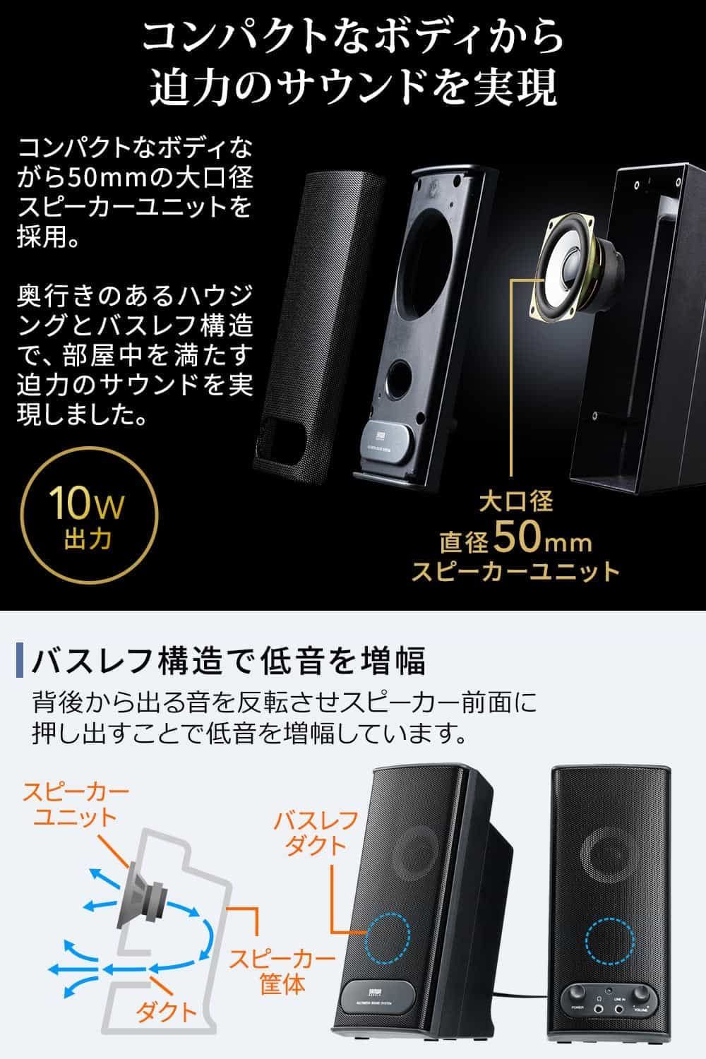50mmの大口径スピーカーユニットを採用し、奥行きのあるハウジングとバスレフ構造で広がりのある音を再現できる2chマルチメディアスピーカーです。スピーカーの角度がやや上向きなるよう設計しているので、音が広がりやすくなっています。