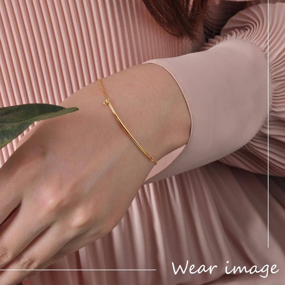 トレンドのメタルパーツを取り入れた遊び心のあるブレスレット。デイリースタイルに溶け込むデザインが人気を呼んでいます。手元に沿う華奢な緩いカーブラインが上品なデザインで、あなたをよりエレガントな印象に見せてくれます。揺れるキュービックが輝くアクセント。ファッション性が高いねって褒められること間違いなし! いま取り入れたいデザインです。 【商品仕様:サイズ】チェーン:約15cm+アジャスター3cm、モチーフ部分:縦約0.6cm×横約4.0cm、バー厚み:0.1cm 【商品仕様:素材】トップ:シルバー950(イエローゴールドメッキ)、チェーン:シルバー925(イエローゴールドメッキ)、キュービックジルコニア