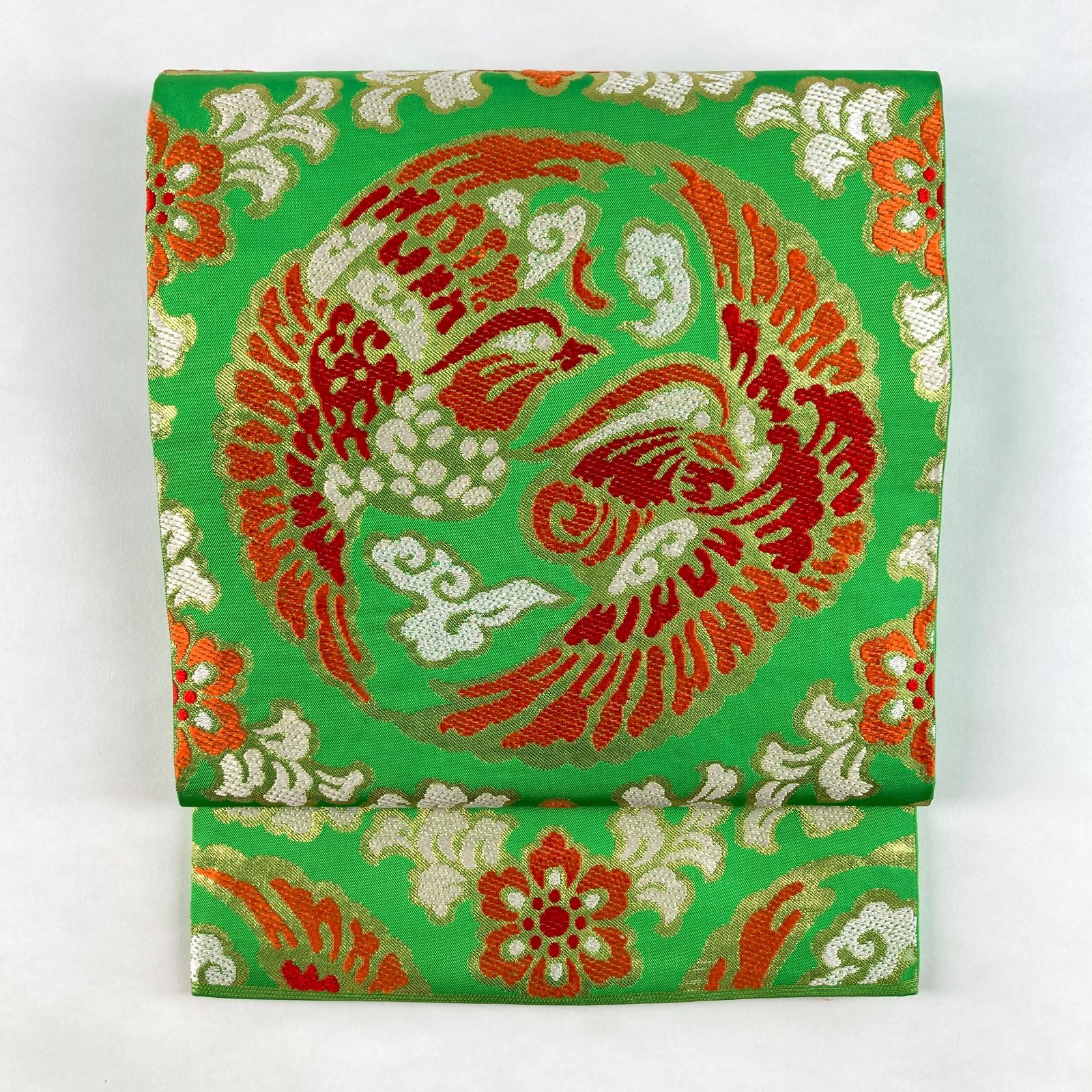 たんす屋 リユース帯 帯 袋帯 黄緑 セミフォーマル フォーマル 織り 向かい鳥文 絹 本袋六通 未洗い MS 6326