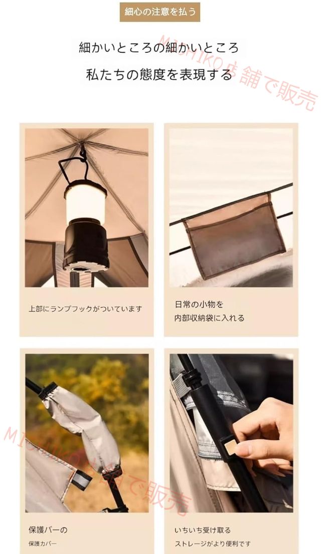 【UVカット】優れたUPF50+の紫外線カット機能により、真夏の日差しから肌をしっかり守ってくれます。また、ポールは高強度なアルミ合金を使用しており、耐圧能力に優れています。テントポールは8.5mmの高強度ガラスファイバーを採用しており、軽量で頑丈、さらに安定した耐圧性能を持っており、強風の中でも耐えることができます。