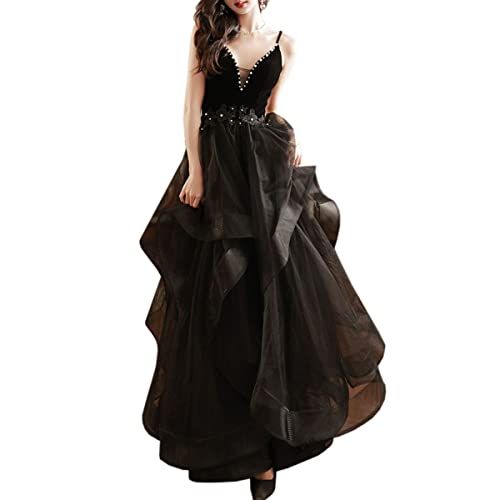 [CHUMO] ドレス イブニングドレス パーティードレス ロングドレス レディース 袖なし チュール Aライン ロング丈 演奏会 発表会 披露宴 お呼ばれ 結婚式 二次会 フォーマル エレガント (ブラック,S,S)