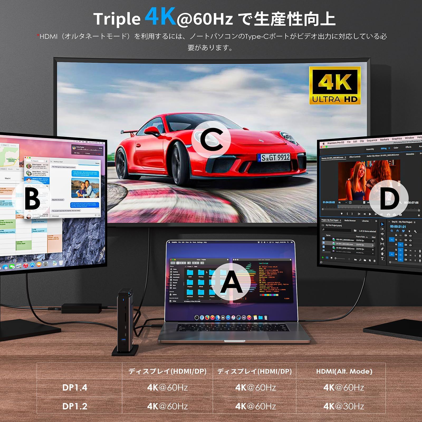 【マルチタスクで生産性向上】:3つの4Kモニターに簡単に接続できます!HDMI(Alt.モード)ポートで4K@60Hzの卓越した出力を実現し、ビデオ編集やゲームに最適です。DisplayLink-6950チップセットは、DISPLAY 1/2(HDMI/DP)ポートでデュアル4K@60Hzディスプレイをサポートし、M1/M2/M3 Macのディスプレイオプションを拡張するのに最適です。ウェブ閲覧や生産性アプリケーションに最適ですが、ゲーム集中的な使用にはお勧めしません。