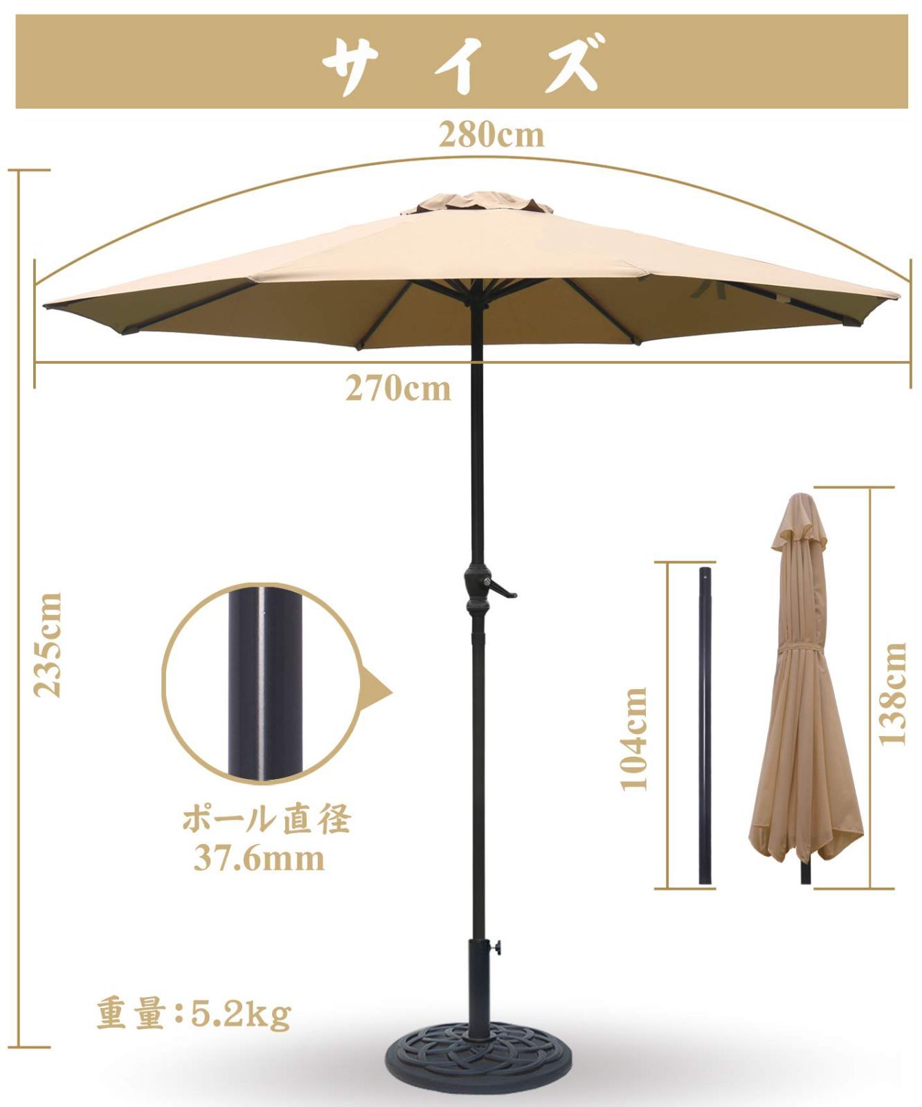 UVカットが施された270cmという大型パラソルが強い日差しから守ってくれるので