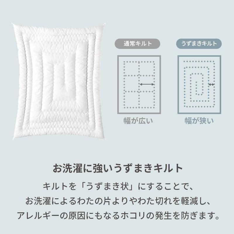 掛け布団はお洗濯に強い「うずまきキルト」を採用。わたの片寄りやわた切れを軽減し、ホコリの発生を防ぎます。