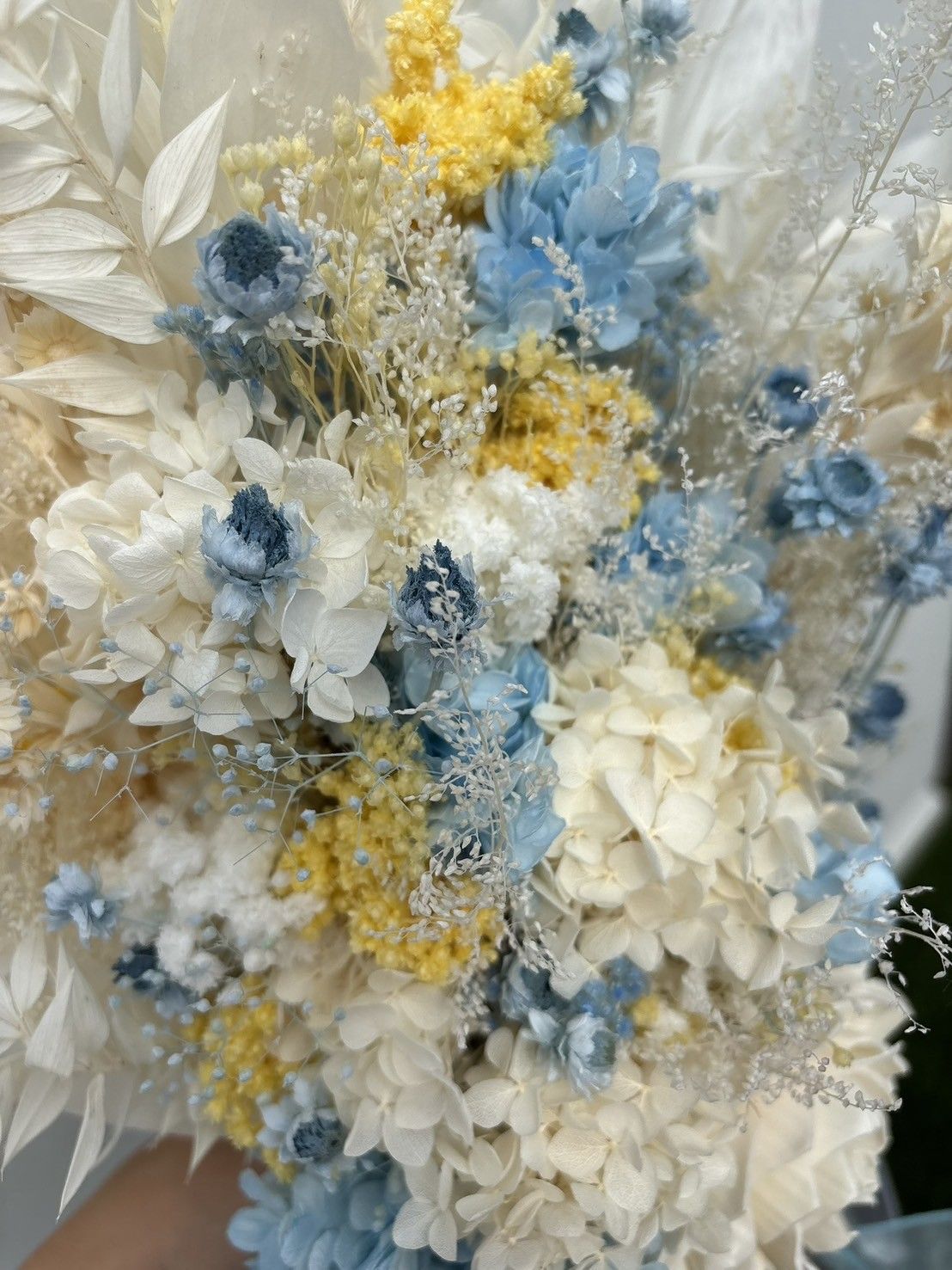 #ドライフラワー#インテリア#花#白#黄色#水色#スワッグ#ブーケ#ウエディング#ウエディングブーケ#かわいい#おしゃれ#高級#ウォールデコ#壁掛け#お祝い#プレゼント