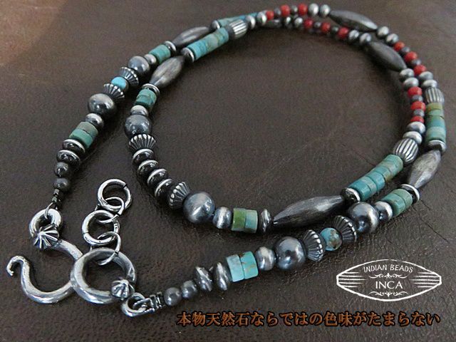インディアンジュエリー ビーズネックレス ターコイズ シルバー925 コーラル ナバホパール inca-tq 4 coral