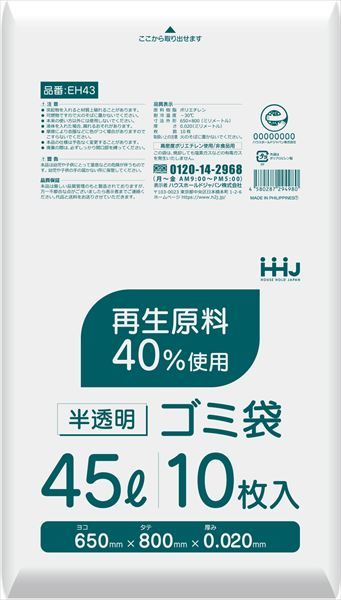 80点セット EH43 再生原料40%入 45L 半透明 ハウスホールドジャパン 包装 梱包