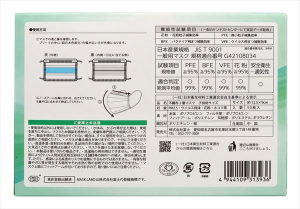 PFEフィルターを採用した不織布3層マスクの50枚入タイプです。PFE、BFE、VFE99%カット オメガプリーツで顔にフィットしやすく耳紐が3mm平ゴムで耳が痛くなりづらいです。全国マスク工業会会員です。125mm×90mmの子供サイズとなります。