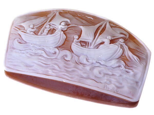 美しい船を繊細に彫刻で演出した、素晴らしい高級シェルカメオルースです!