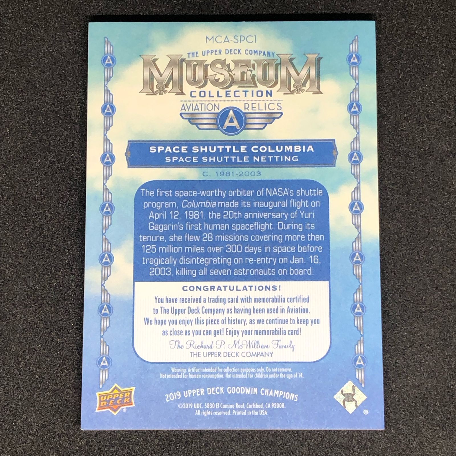 スペースシャトル コロンビア 宇宙船パーツ 2019 Upper Deck Goodwin Champions Museum Collection Aviation Relics MCA SPC 1