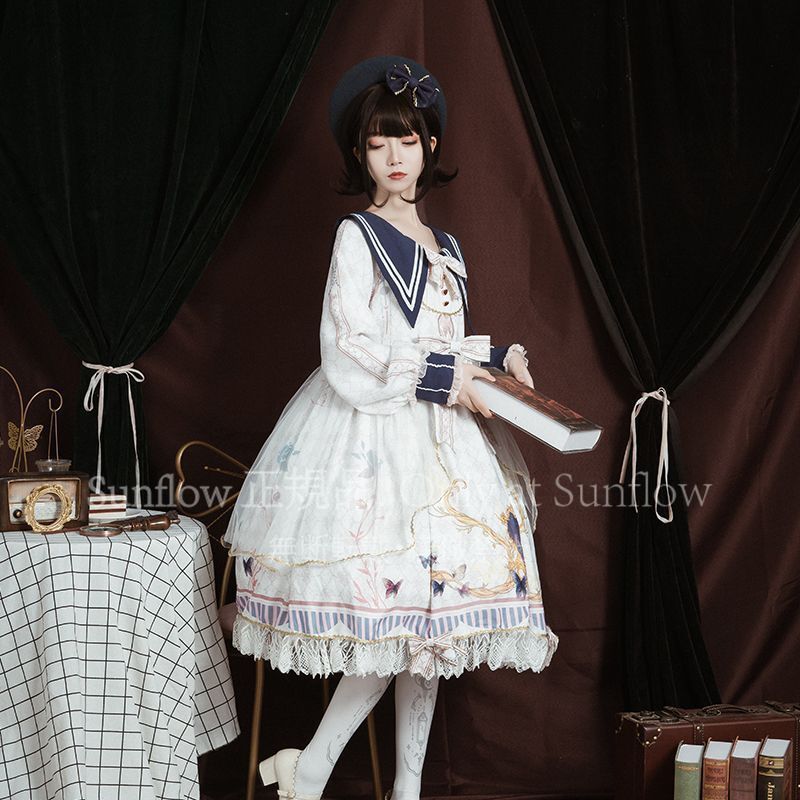 オリジナルロリータ 蝶恋紛飛OP ロングスリーブ デイリー エレガント プラスサイズ ワンピース ネイビー ホワイト ブラック S 2 XL ゴシックロリータ イベント プレゼント