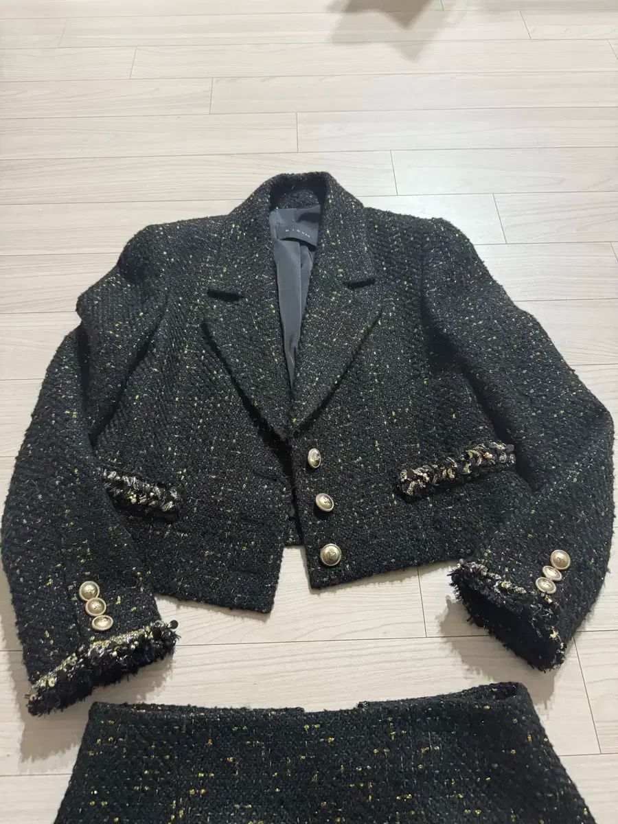 これはミシャツイードのブラックジャケットスカートのセットアップです。高級感のあるツイード素材で、洗練された印象です。セットアップで着るとフォーマルで、別々にコーディネートしても汎用性が高い。他に質問がない場合は、すぐに安全な支払いを行ってください!