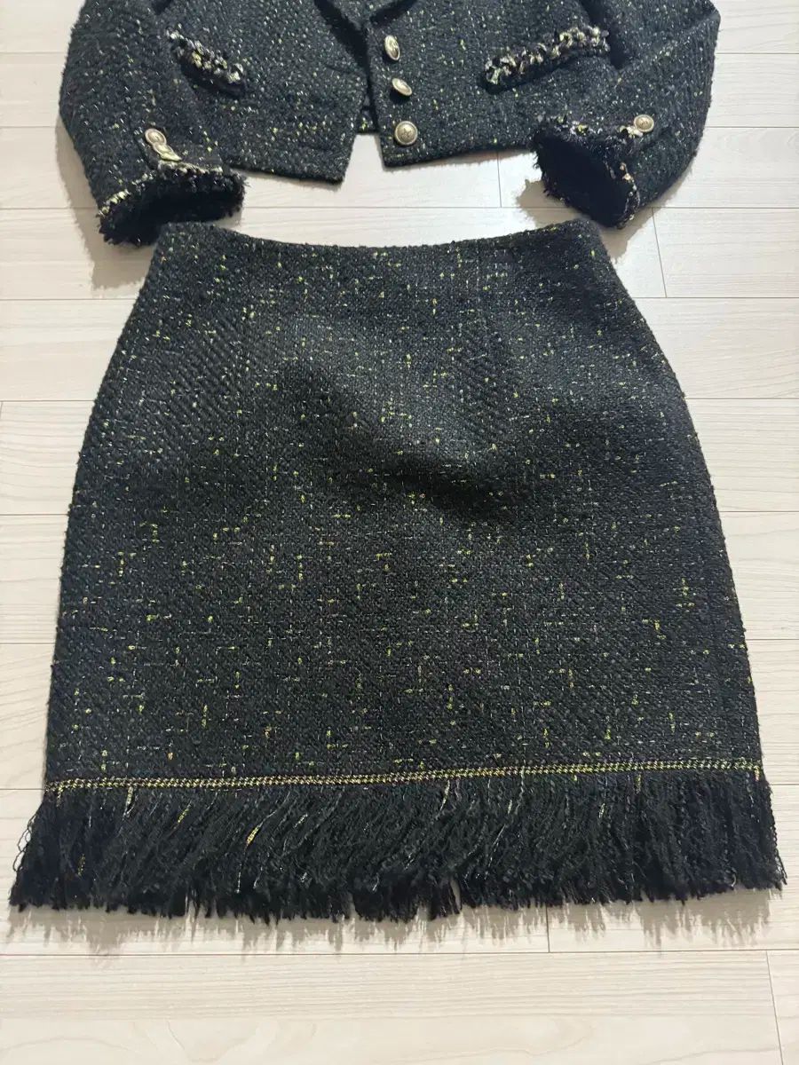 これはミシャツイードのブラックジャケットスカートのセットアップです。高級感のあるツイード素材で、洗練された印象です。セットアップで着るとフォーマルで、別々にコーディネートしても汎用性が高い。他に質問がない場合は、すぐに安全な支払いを行ってください!