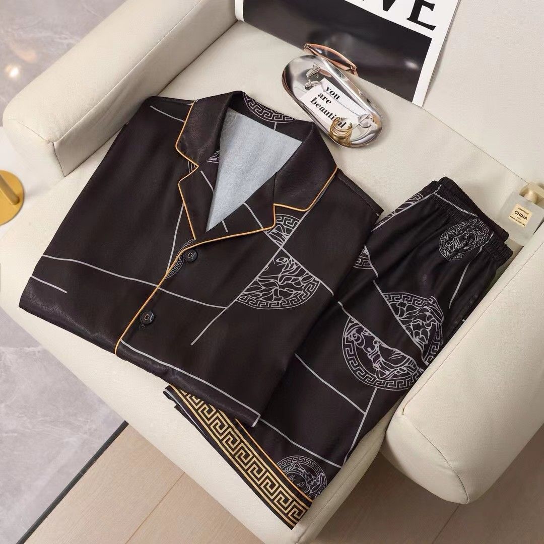 これは Versace ヴェルサーチ のクラシックなヘッドデザインを備えた な のメンズパジャマセット ショートパンツとショートスリーブ です 輸入のシルクサテン生地を使用しており 内側には包み縁が施されています