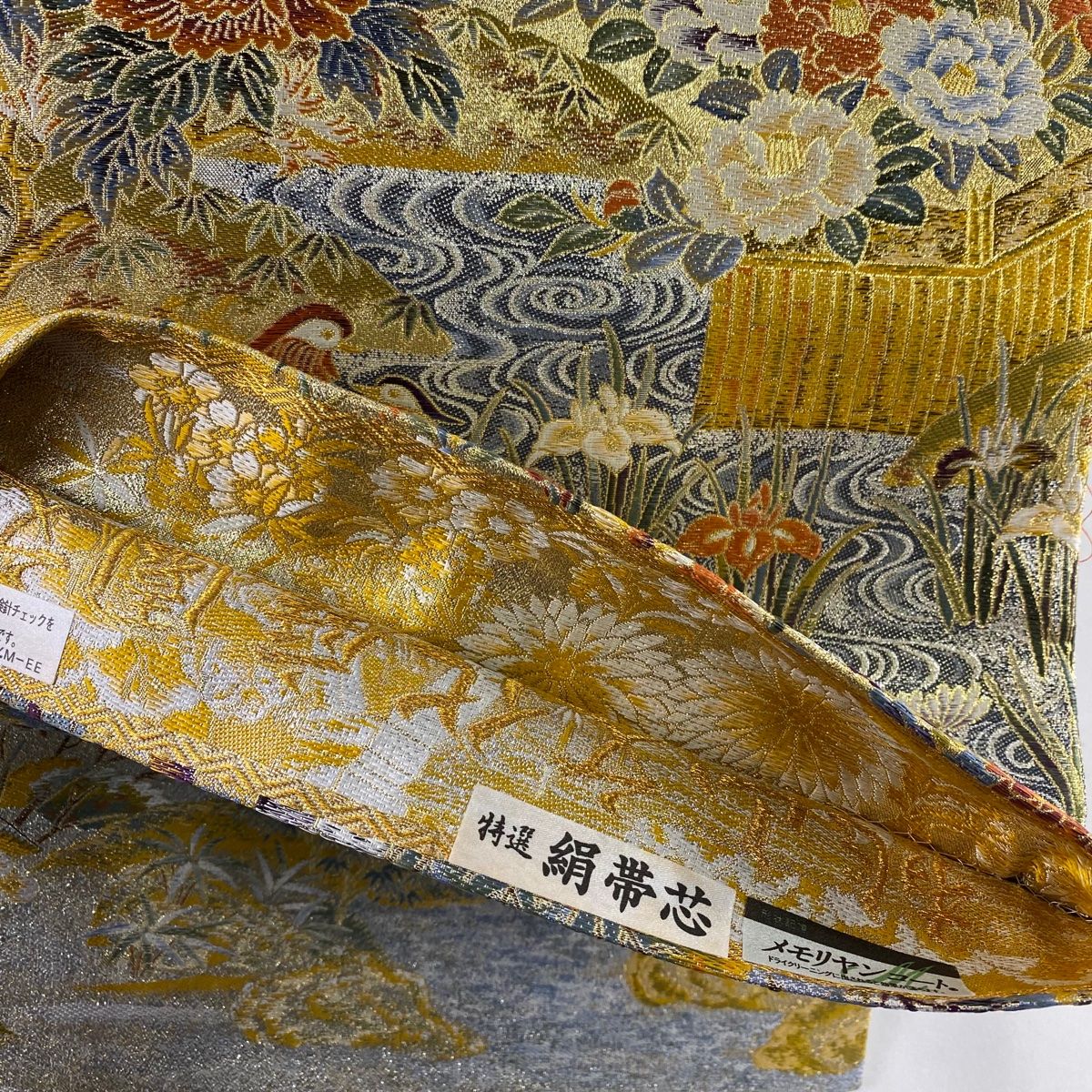 丸帯 桃山文化庭園文 松竹梅 花鳥 金糸 箔 金色 お太鼓柄 正絹