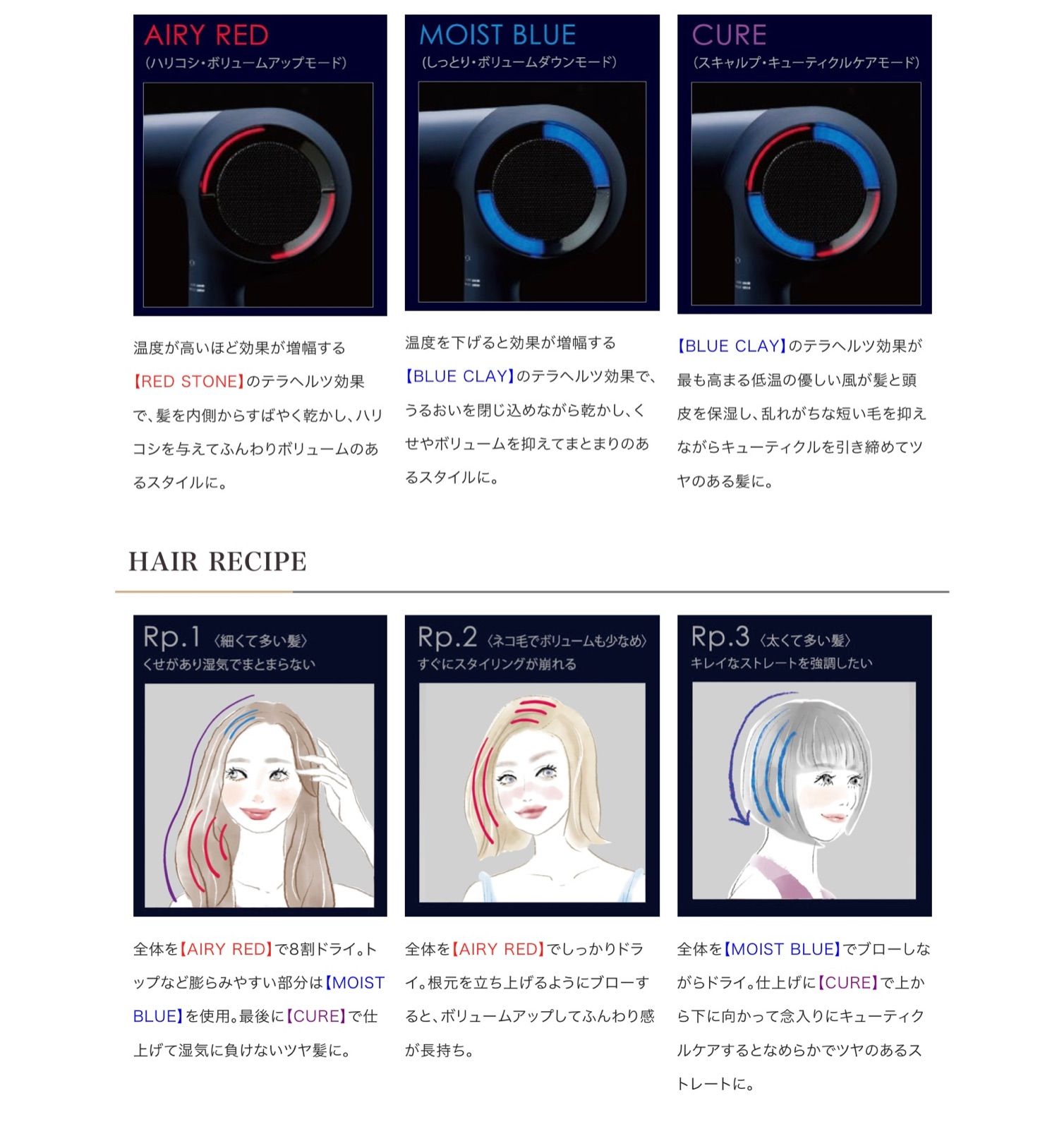 ・CURE(赤色青色点灯)… ダメージの気になる部分に風をあてると、よりツヤ感を与えます。