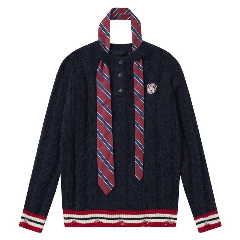 ♥ h アメリカンヴィンテージ風 ダメージ加工 × ネクタイデザイン ニットセーター 男女兼用 | ゆるだぼ 秋冬トップス