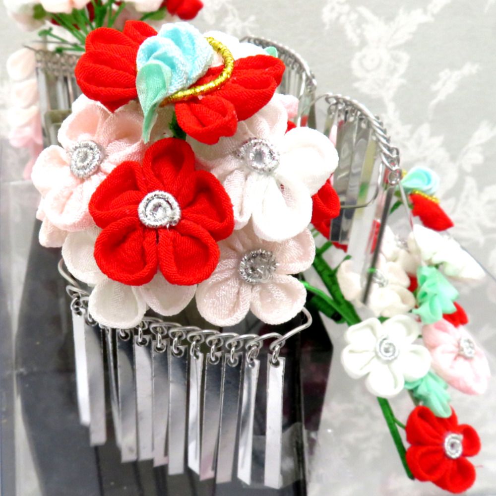 髪飾り・かんざし つまみ細工 丸つまみ 勝山かんざし 3点セット 赤 ピンク 白 花 女児用 和装 ヘアセット 七五三 お正月 ひな祭り 未使用品
