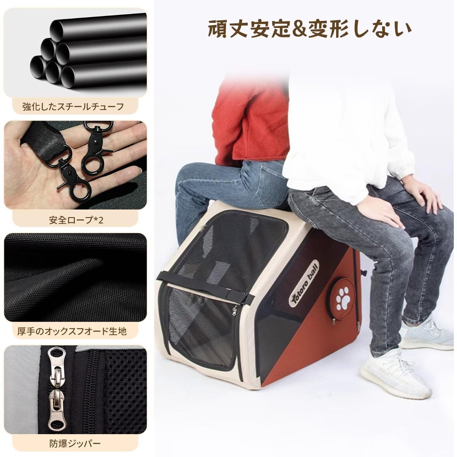 【安定性抜群】後部座席にシートベルトでガッチリ固定でき、走行中の揺れやブレーキでもガタつきゼロの安定感。施錠機能付きファスナー(チャイルドロック付き)だから、わんちゃんが中から引っかいてもロックが外れる心配がなく安心です。ハイグレードスチールフレームがしっかりと全体を支え、車内での衝撃もしっかり吸収。さらに、ケージ本体に装備された頑丈な安全ベルトが2本で、万が一の急停車時にもケージごと前に滑り出すリスクを大幅に低減します。軽くて柔軟な素材でありながら、必要な強度はしっかり確保。大切なペットを預けるケージだからこそ、固定性、構造、細部の作りまで妥協なく仕上がっています。ドライブ中のペットの安全と、運転する飼い主さんの安心を、確かな設計でしっかりサポート。