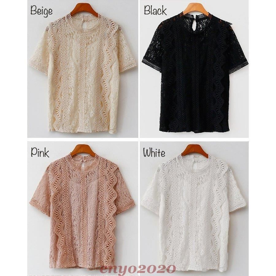 ブラウス レディース フリルレース トップス フリル レース 半袖 ハイネック 韓国 総レース カットソー シャツ08213