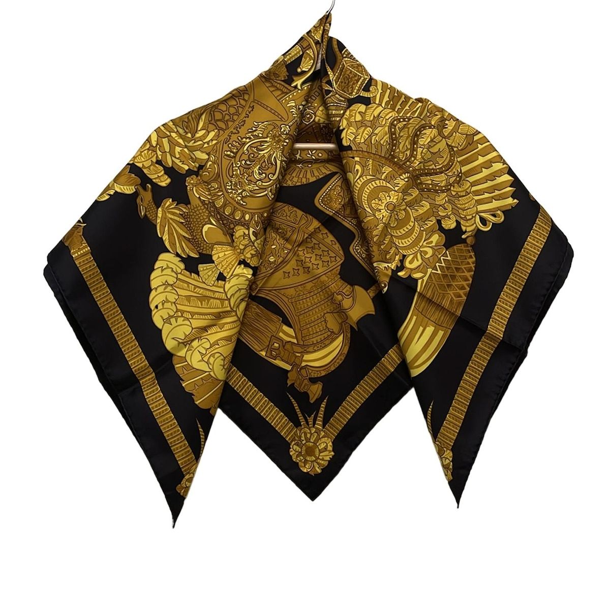 HERMES エルメス スカーフ カレ90 黒×ブラウン×イエロー ARMETS en PANACHE