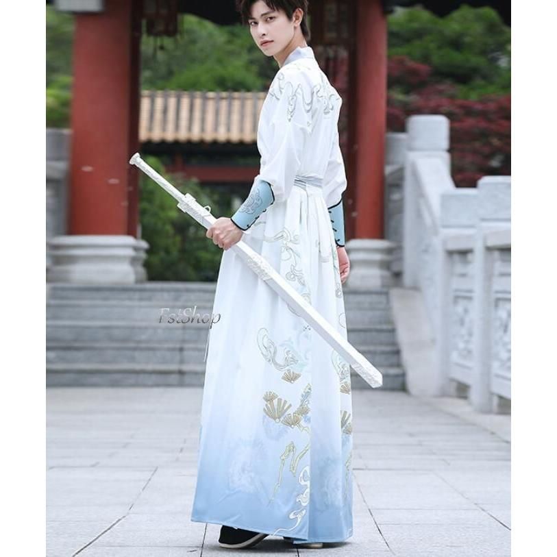漢服コスプレ服 舞台ステージダンス衣装 唐装 2点セットアップ演出服メンズ レディース古代コスプレ衣装カジュアル大人用 長袖 交差襟コスプレ衣装 トップス 袴風スカート学園祭パーティー中華服 上下セットcosplay仮装 団体服イベント男性ホワイト剣士 武術服カンフー文化祭