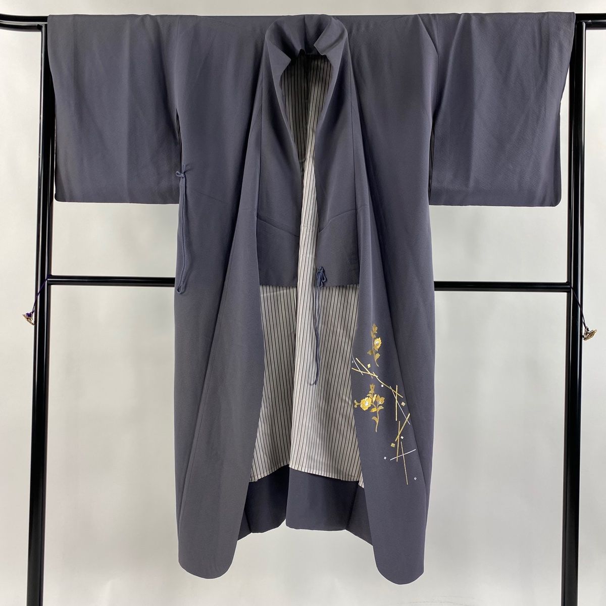 道中着 身丈127 cm 裄丈66 M 和装コート 着物衿 草花 箔散らし 金銀彩 青灰色 正絹