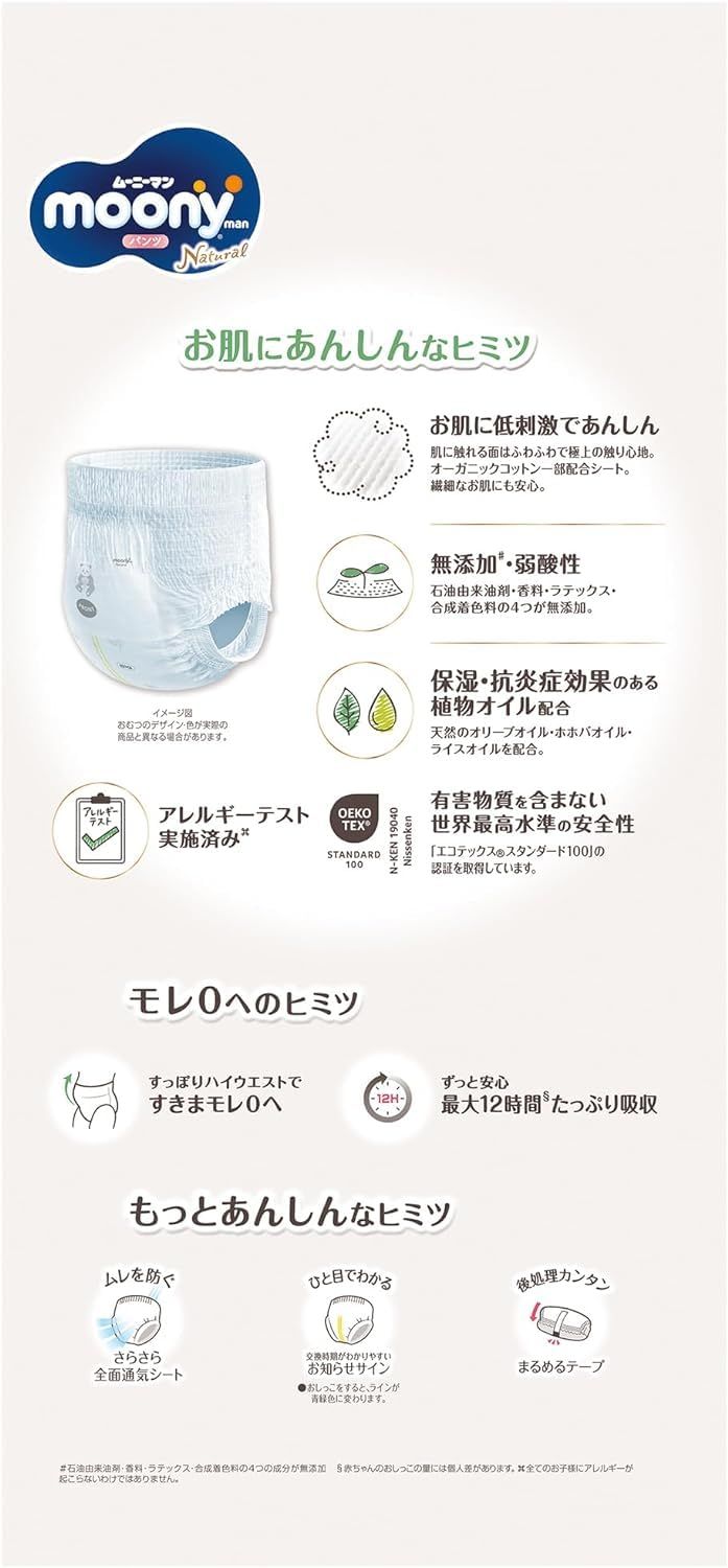 商品紹介 「ナチュラルムーニーマン ビッグサイズ」は、表面シートにオーガニックコットンを配合しやわらかい肌触りを実現。 「無添加」&「弱酸性」仕様のシート採用。
