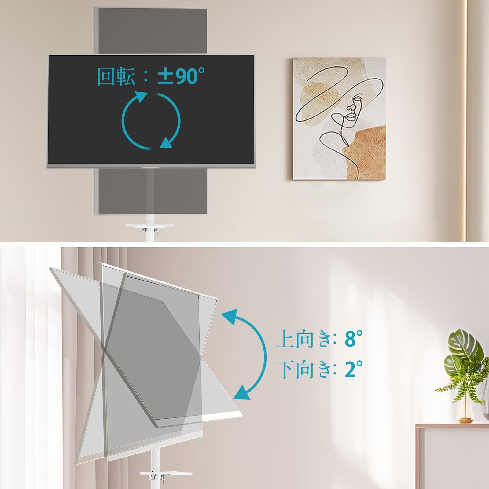 【多角度調整可能】チルト機能付き、上向き8°と下向き2°に調整可能で、映り込みを回避できます。180°回転機能付き、ネジを緩めるなどの手間が全くなくなり、用途に応じてテレビの縦使いと横使いを手軽に変更できます。