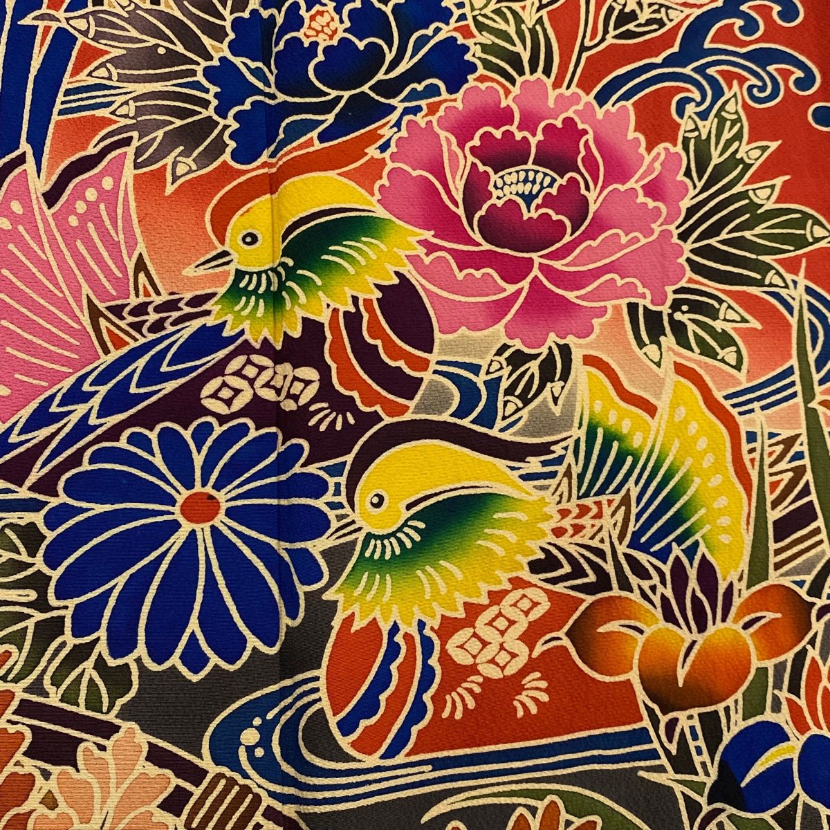 振袖 身丈164 cm 裄丈65.5 M 袷 やまと 鴛鴦 草花 染め分け ぼかし 茜色 正絹