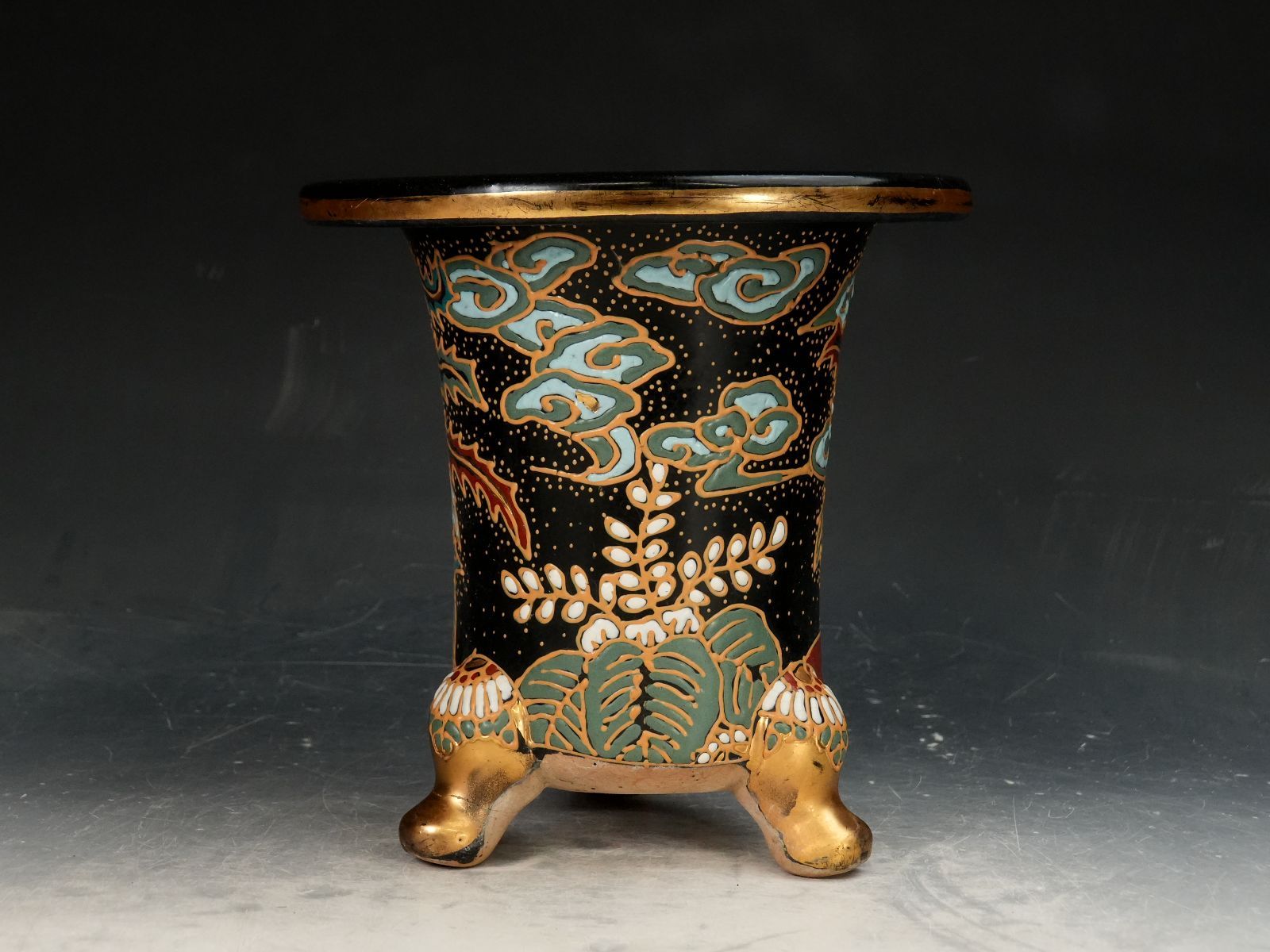 ☆黒釉金彩色絵鳳凰舞天図外縁猫足丸鉢☆
