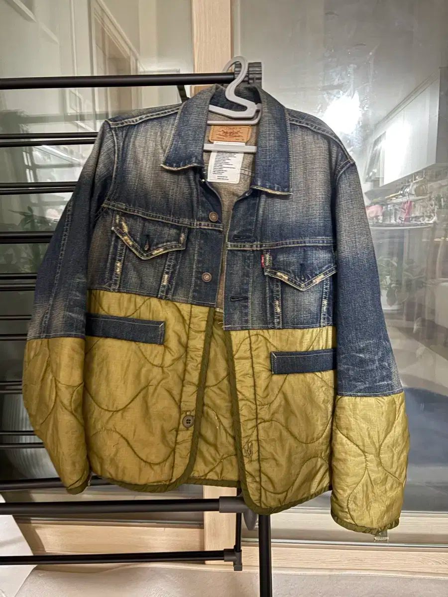 これはオルレアンストアで作られたリーバイスのトラッカージャケットです。トップはデニム、ボトムはカーキキのキルティングデザインがユニークです。このアウターはユニークなデザインなので、素晴らしいアクセントになります。