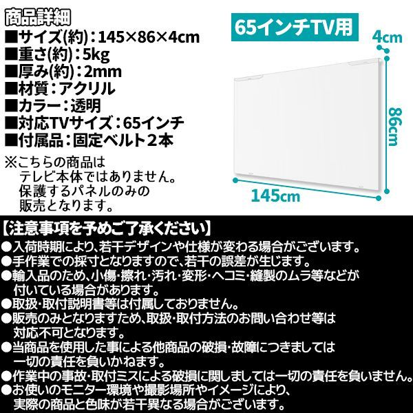 液晶テレビ保護パネル 65インチ 65型 クリアパネル 固定ベルト付 2 mm厚