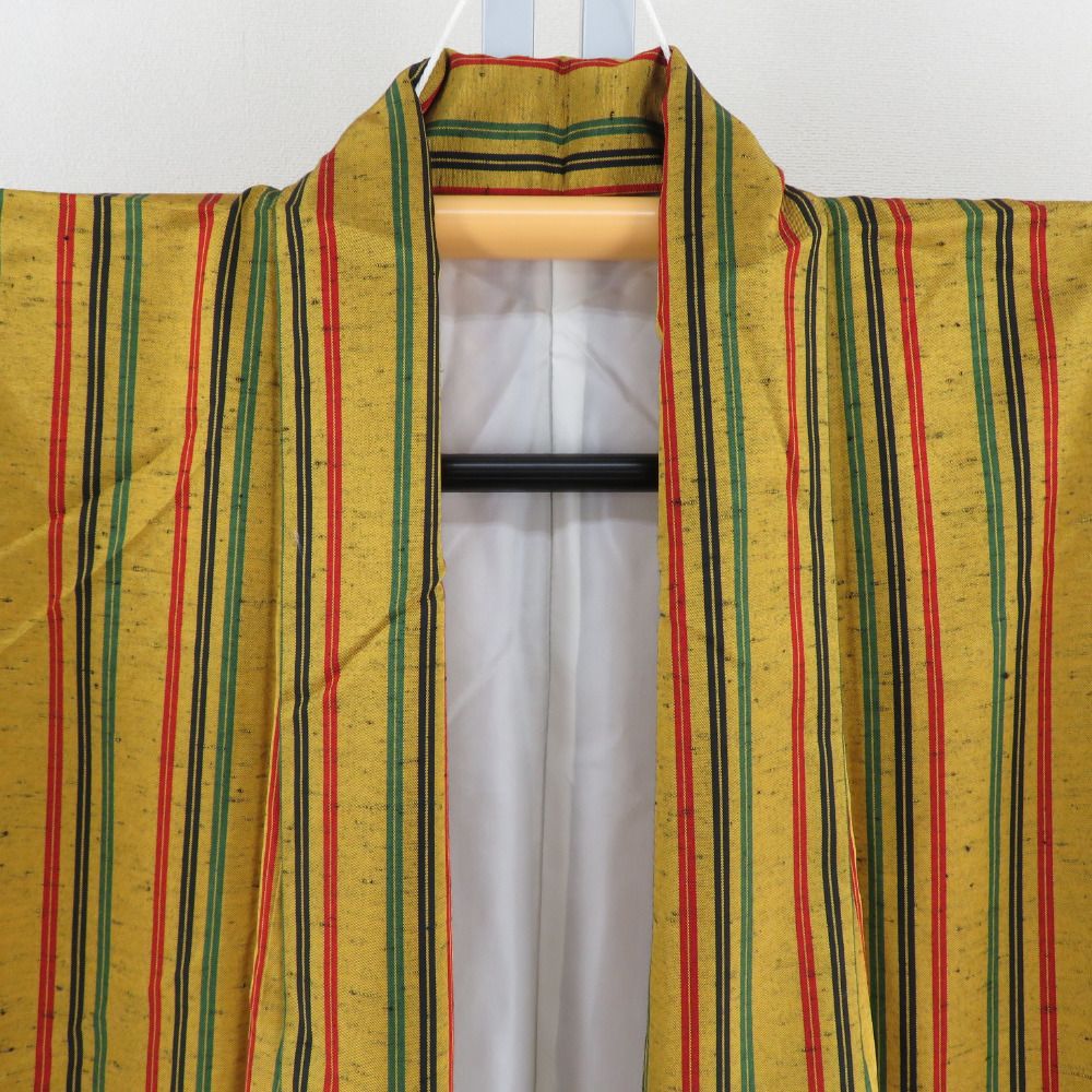 紬 着物 縦縞模様 辛子色x黒色x赤色x緑色 袷 広衿 絹 仕立て上がり着物 身丈164cm