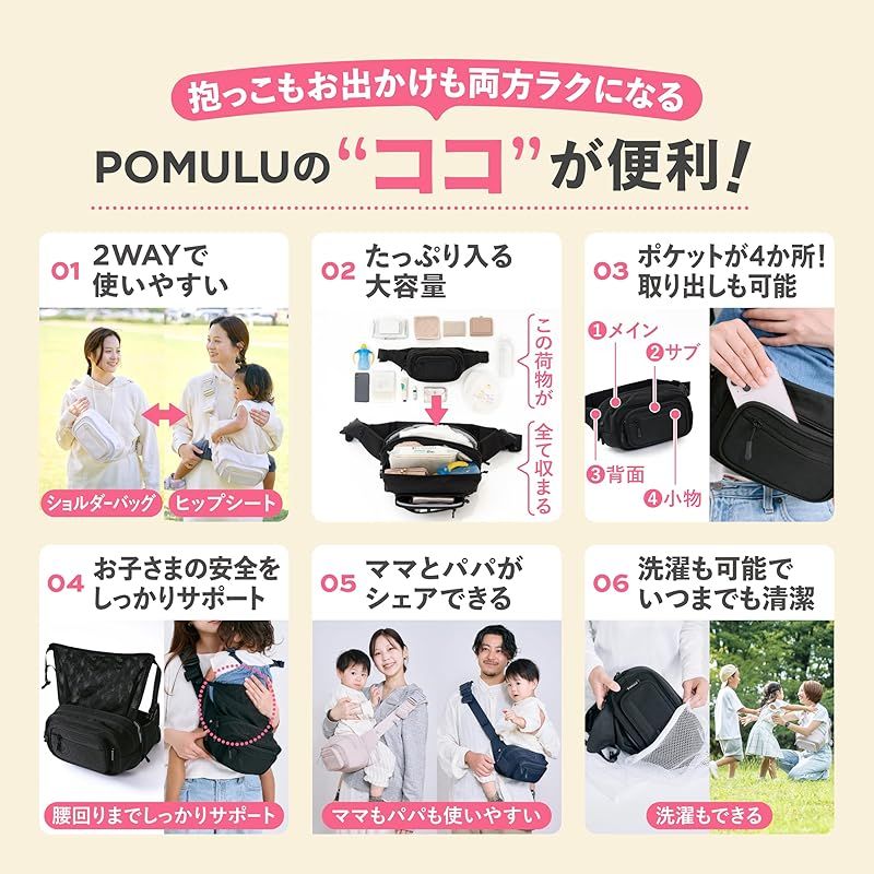 POMULU ポムル 子育てベストアイテム大賞受賞 ヒップシート ショルダーバッグ 2 WAY 耐荷重20 kg 抱っこ紐 バッグ スリング カジュアルブラック ヒップ シート ヒップシートバッグ ヒップバッグ ボディバッグ ナチュラルアイボリー 1