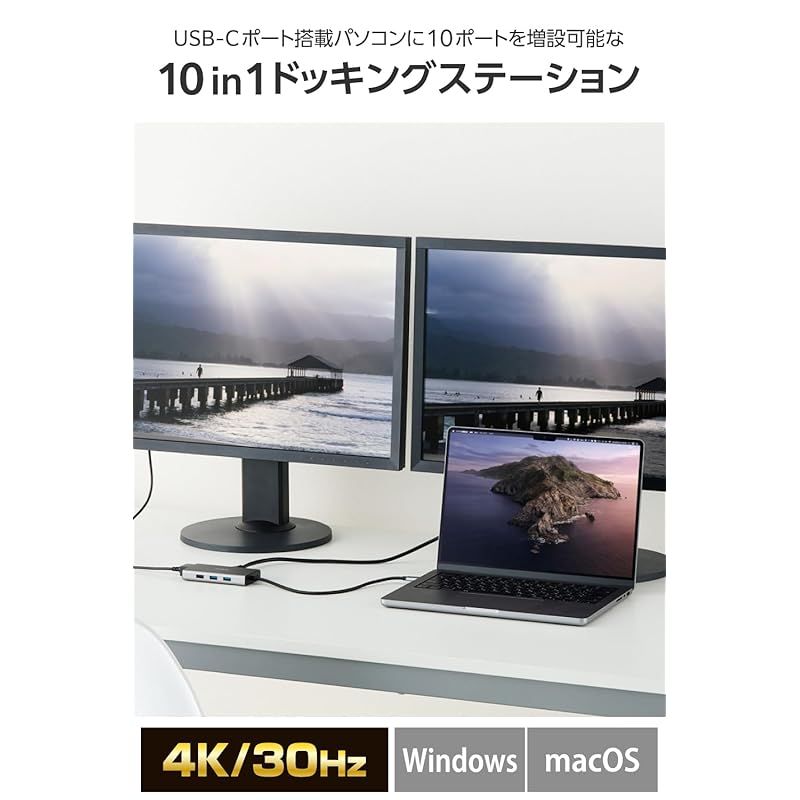 映像も音声も、10ポートをこの1台に。薄型ノートパソコンの機能を拡張する、USB Type-C(TM)接続ドッキングステーションです。最大3画面で同時に高画質のコンテンツを楽しめる拡張・ミラーリング機能を搭載しています。