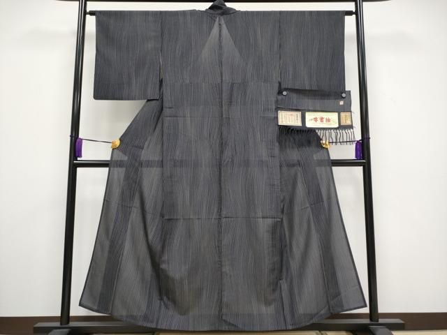 上 夏物 石川県指定無形文化財 夏牛首紬 白山工房 手織り よろけ縞 黒地 証紙付き s 5