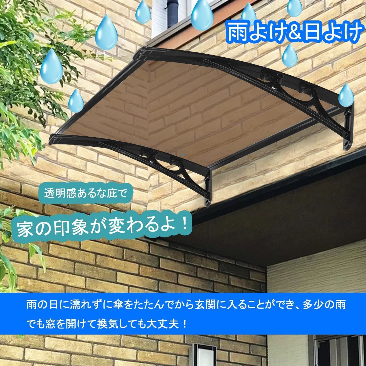 「適用場所」:ネジで家の壁に打ち付け装着するのが取付方法です。可分離タイプ且つ大きいので玄関だけでなく自転車置き場などに設置してもいいですよ。高級感あるな庇で玄関、窓、または家の印象が変わります!