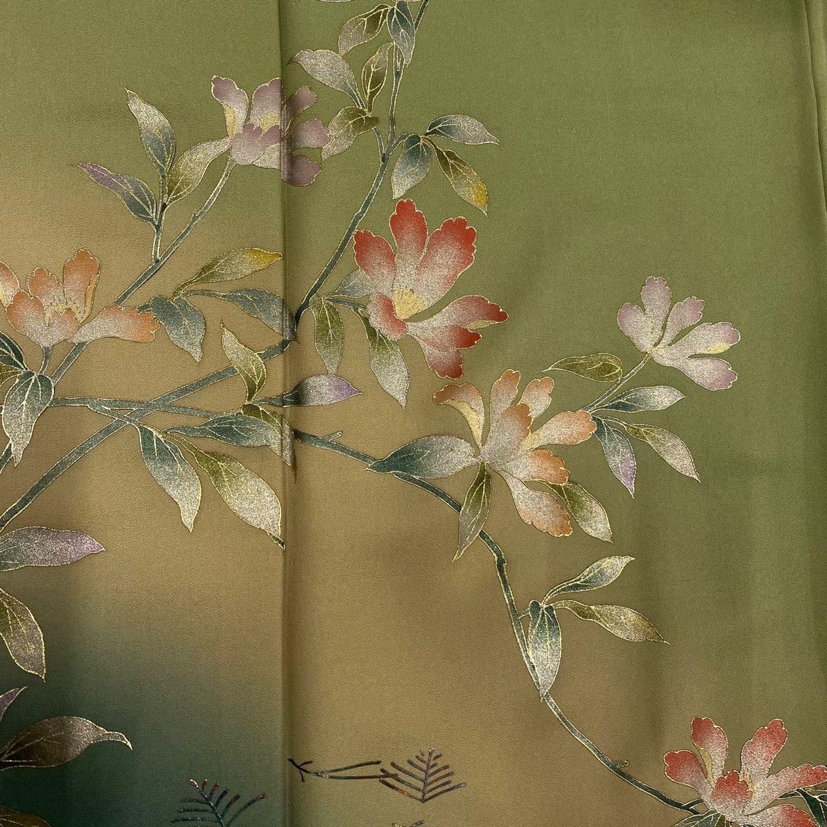 訪問着 身丈164 cm 裄丈66.5 M 袷 枝花 若松 金銀彩 ぼかし よもぎ色 正絹 秀品