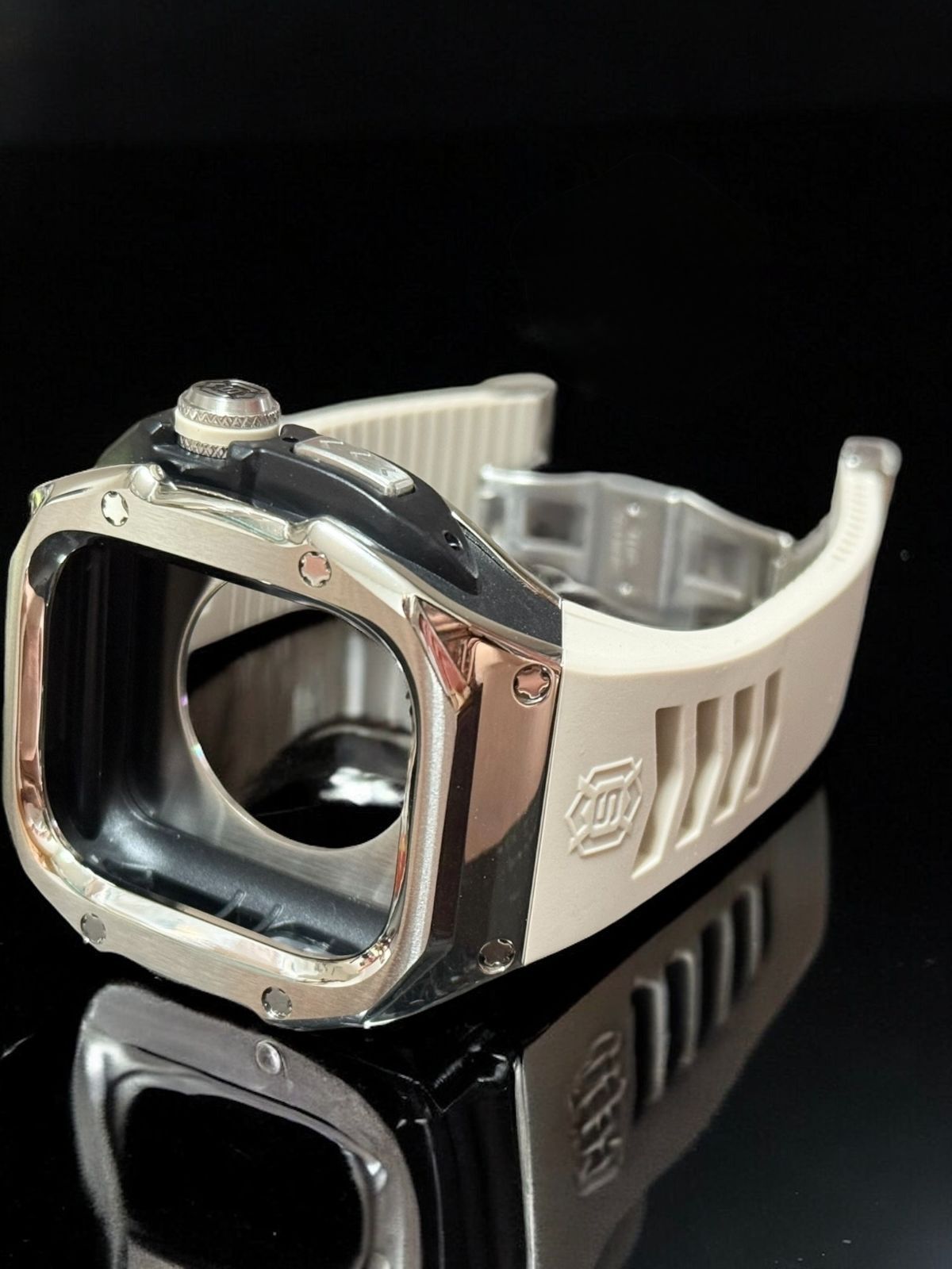 Apple Watch Ultra 49mmに対応した、重厚感と高級感を兼ね備えたプレミアムカスタムセットです。洗練されたデザインと上質な仕上がりで、Apple Watchをラグジュアリーな一本へと昇華させます。
