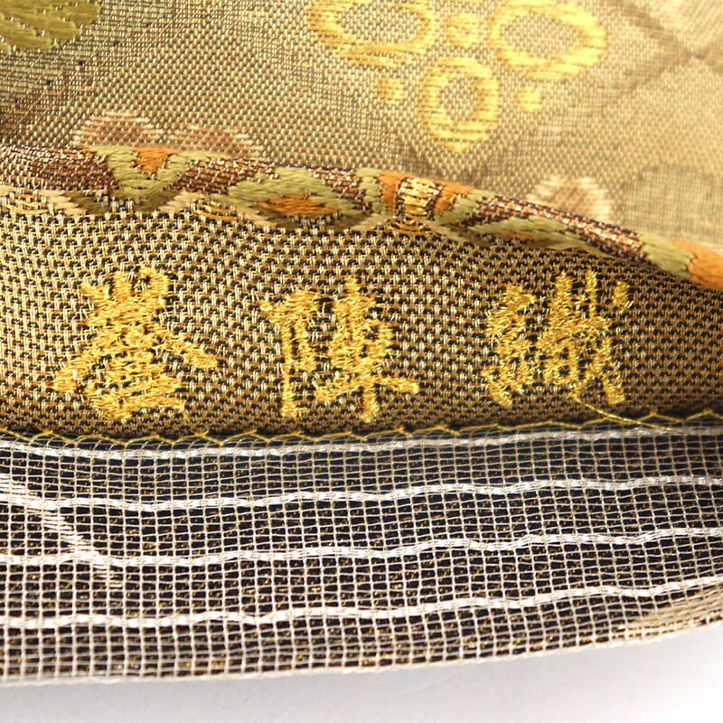 誉陣織は、誉田屋源兵衛の帯です。誉田屋源兵衛は、京都|西陣で280年以上の歴史を持つ帯匠で、西陣織の中でもトップクラスの技術と芸術性を誇る老舗です。少し緑みのある金の上品な袋帯。花菱や菊、梅、楓などの柄が菱に表現されておりますね。エンジ、芥子、抹茶色、灰紫などの和の色がとても美しいですね。品格のある落ち着きの帯で、上品な着こなしをお楽しみいただけます。両面帯なので、裏側はグレーと金の地に、抽象的な柄が表現されております。織の雰囲気、柄の上品さが美しい帯ですね。