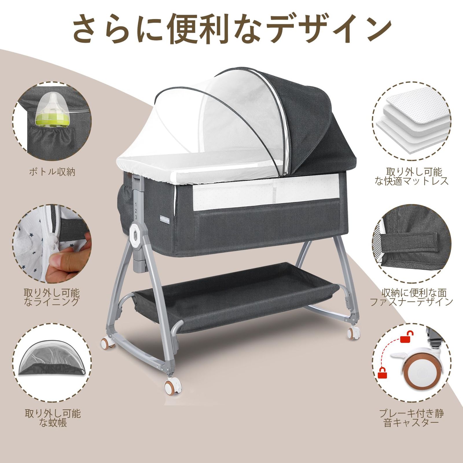 大容量の収納バスケット:ベビーベッドの下部に収納スペースがあり、おむつやおもちゃなどの必需品を簡単に収納できます。サイドには哺乳瓶用のポケットも付いており、使い勝手に優れています。セット内容には、本体、マットレス、モスキートネット、収納バスケット、固定ストラップ、ブレーキ付きキャスター、取扱説明書が含まれています。