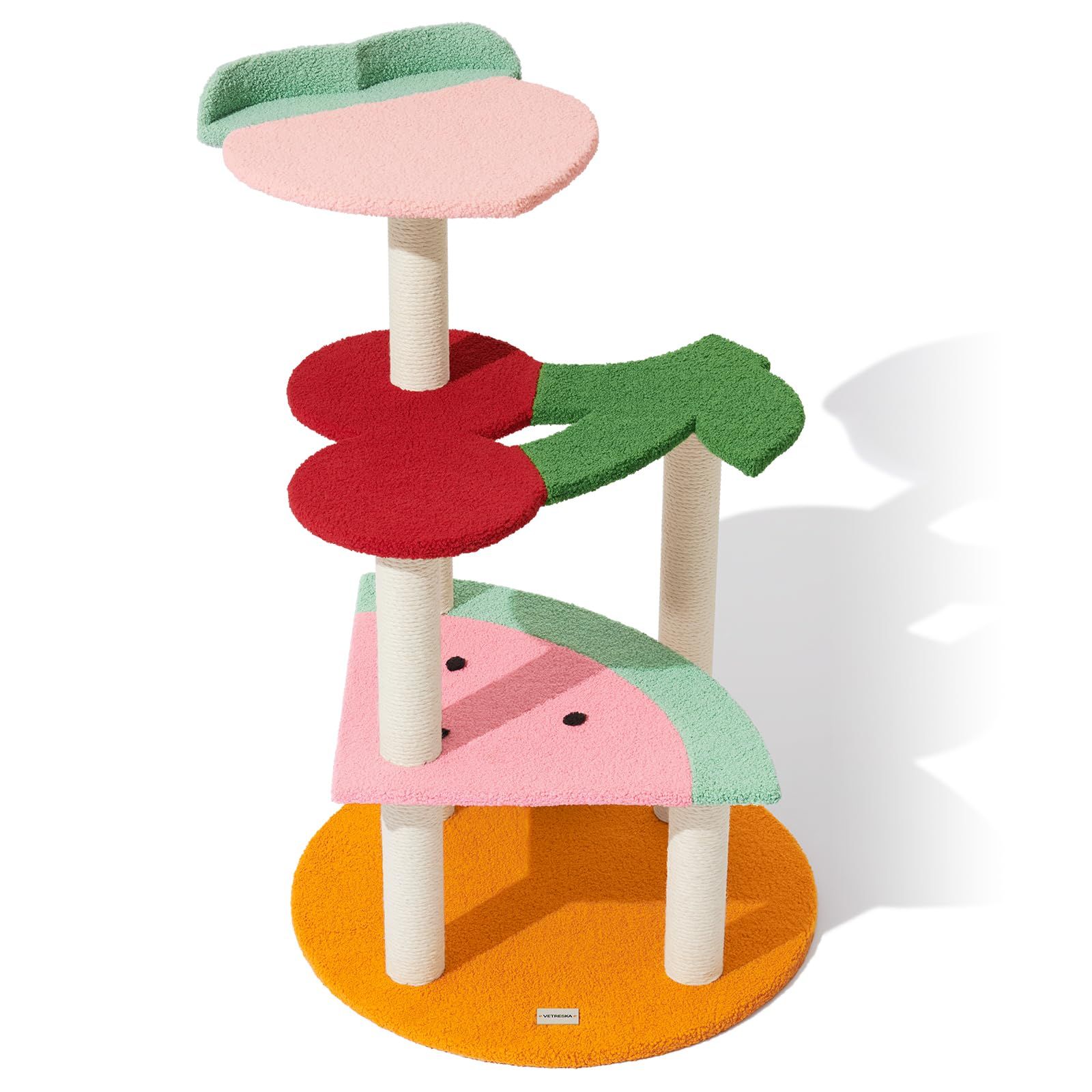 【VETRESKA FRUIT SERIES】キャットツリーにはフルーツをテーマにしたプラットフォームが4段階あります。 ピーチ、スイカ、チェリー、オレンジの模様が猫のコンドミニアムの4層を構成しています。 可愛い猫の家具がご自宅を素敵に彩ります。 猫たちはカラフルなフルーツファームで遊んでいるようなものです。