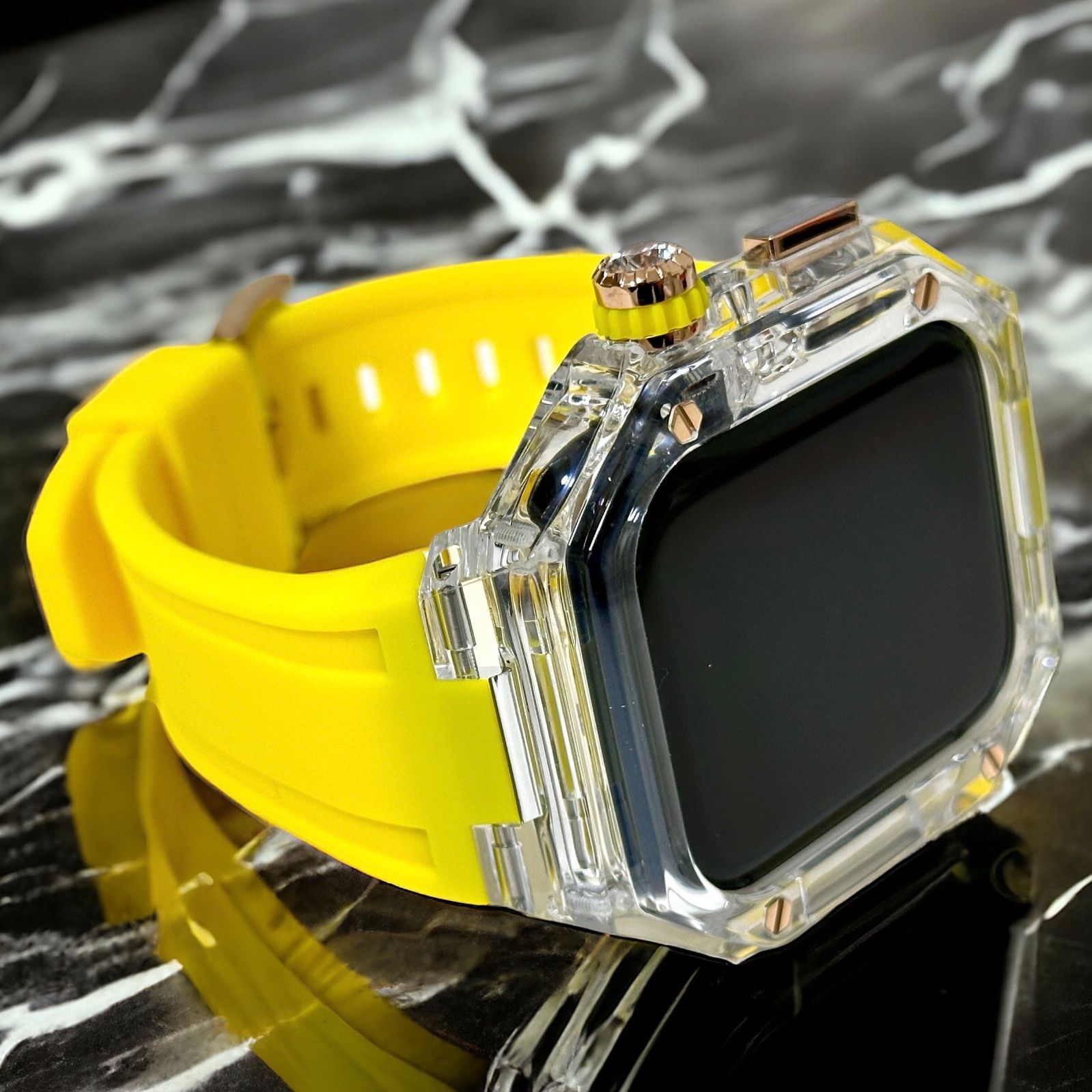 クリスタルクリア イエロー ローズゴールド アップルウォッチ ラバーベルト カバー クリア ケース 40 mm 41 44 45 4 5 6 7 8 9 seスポーツ メンズ レディース 4ネジ Apple Watch バンド オリジナルバックル付き